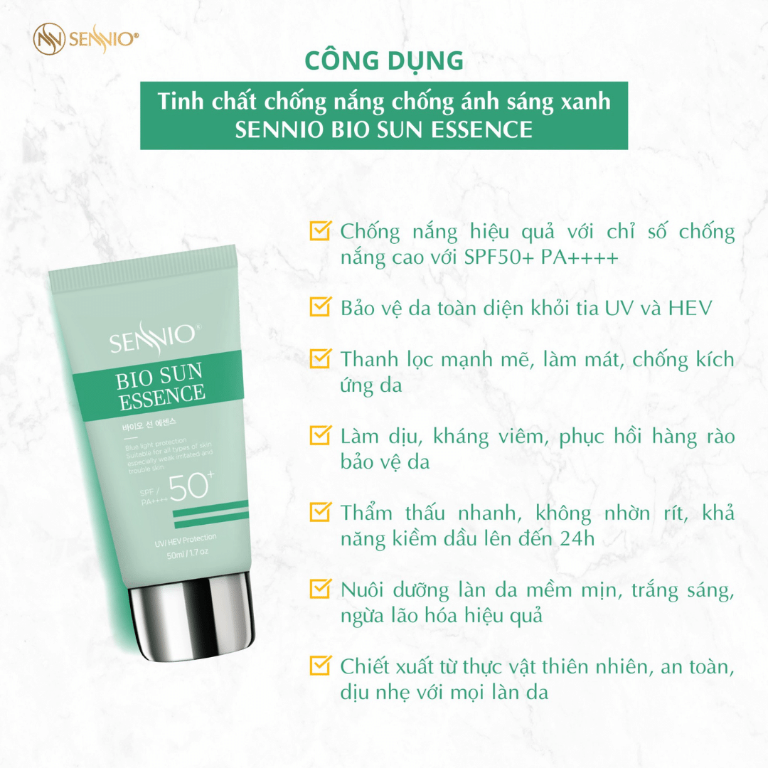 CÔNG DỤNG SẢN PHẨM TINH CHẤT CHỐNG NẮNG, CHỐNG ÁNH SÁNG XANH DƯỠNG TRẮNG DA CĂNG BÓNG, NGỪA THÂM MỤN SẠM NÁM, CHỐNG LÃO HOÁ SPF50++++ SENNIO: